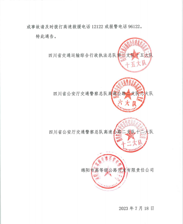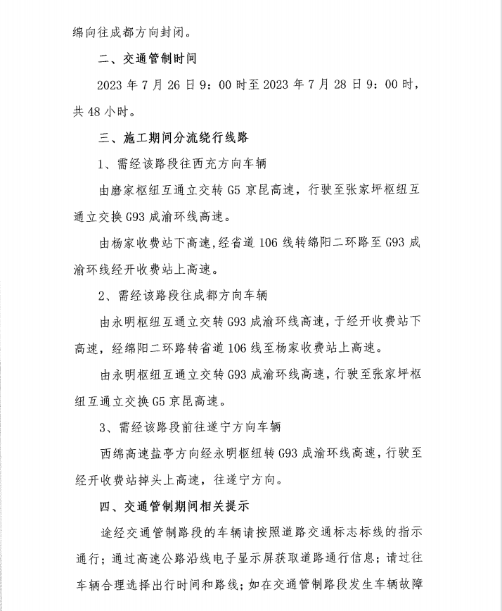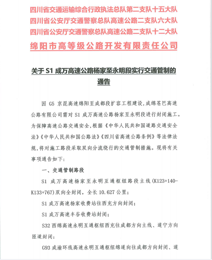 關(guān)于S1成萬高速公路楊家至永明段實(shí)行交通管制的通告