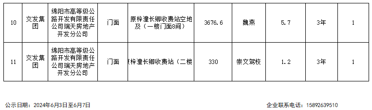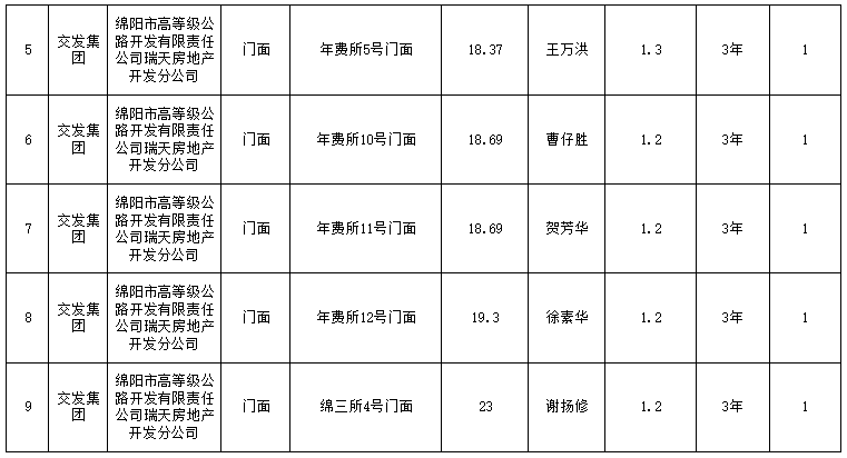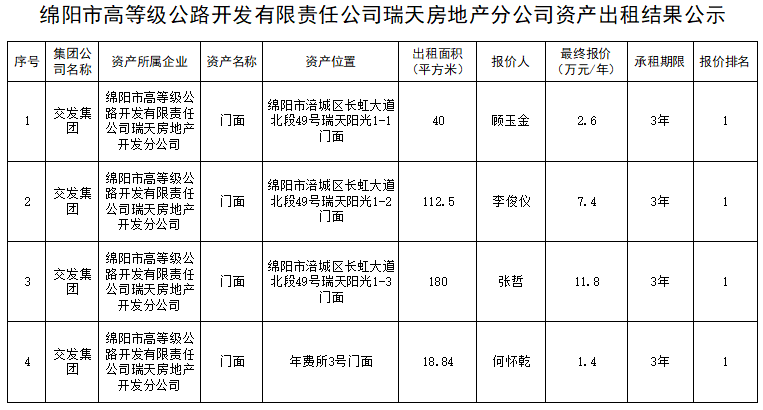 綿陽市高等級公路開發(fā)有限責任公司瑞天房地產分公司資產出租結果公示